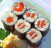 Description: An picture of six plated sushi rolls. The centers are orange, and the top left clearly shows the head of the clownfish Nemo. The text reads, "Sushi, anyone?"