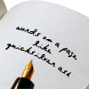 Description: A picture of an opened book. A pen rests on the open pages, near written words: "Words on a page like quicksilver ash"
