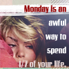 Description: A screenshot of Rose from Doctor Who. Her face is poking out from under the covers. The text reads "Monday is an awful way to spend 1/7th of your life."