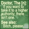 Description: Light green text on a decorative green background. The text is formatted like a dictionary entry, and reads: "Doctor, The [n]: If you want to take it to a higher authority, there isn't one. See also: Bitch, please."