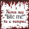 Description: Red text on a white background, with a 'dripping blood' border. The text reads "Never say Bite Me to a vampire."