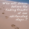 Description: Photo of footsteps on a beach. White text over it reads "Who will dream before the fading tracks of our obliterated steps..?"