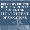 Description: White text on a slate-blue background. Text reads "Being my friend right now may not be the healthiest of avocations."